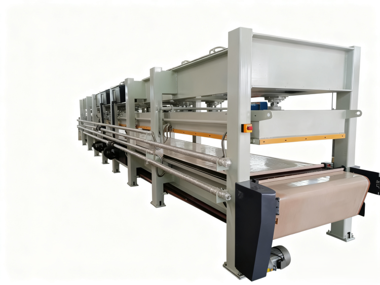 设备结构亮点:在通过式热压生产线基础上优化淋胶系统,配备多组高精度淋胶头(可实现点状、线状、面状涂胶)、胶水恒温加热罐(防止胶水凝固,适配热熔胶、环氧胶等多种胶水类型)、胶水回收装置(减少胶水浪费),同时升级热压复合单元为多层热压结构,提升复合效率与粘接强度。